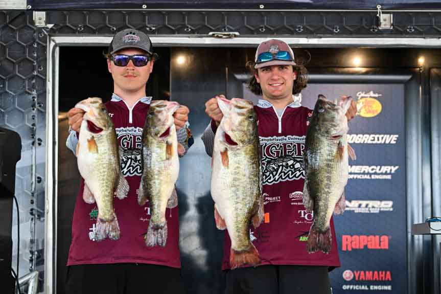 Campbellsville University juniors Corey Yarish and Brock Catlett knocked that goal off their bucket list on Day 1 of the 2026 Strike King Bassmaster College Series at Sam Rayburn Reservoir presented by Bass Pro Shops, landing a limit weighing 31 pounds, 8 ounces to take a 5-5 lead over Southern Arkansas’s Trace Loe and Levi Loe (26-3).